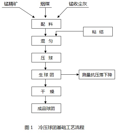 冷壓球團(tuán)生產(chǎn)技術(shù)是利用粘結(jié)劑, 將含錳物料和煤等在常溫下利用專用壓球設(shè)備壓制成型, 進(jìn)行烘干( 200 ℃) 后直接入爐冶煉?;A(chǔ)工藝流程如圖 1。