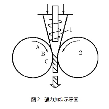 采用強力加料對組份多、比重相差大的錳粉礦壓制球團(tuán)比較合適。強力加料除有加料作用外, 還對物料有預(yù)壓作用, 破壞物料的“達(dá)橋效應(yīng)”, 排除物料中的部分氣體, 如圖所示, 物料在A 處填滿球窩, 在 B、C 處由于螺旋的作用物料只能強迫地留在球窩內(nèi),隨著對輥轉(zhuǎn)動脫出球窩, 在之前始終是充滿的。
